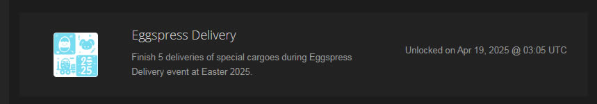 If you make at least 5 deliveries from Chocolate Factory near Frankfurt you also get achievement. The cargoes for this event are called Easter Supplies and Egg Baskets.