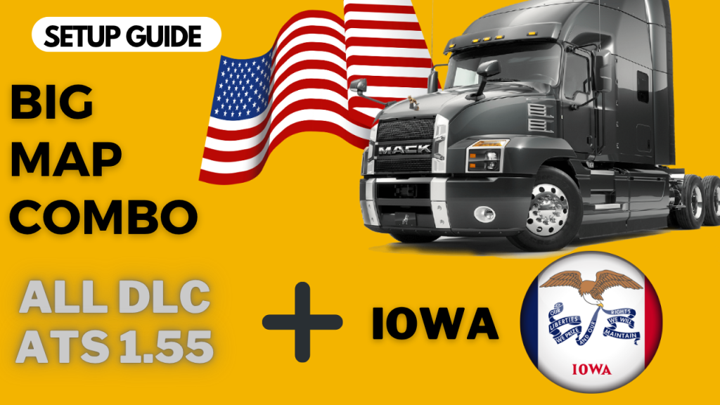 The first big map combo for ATS 1.55 with Iowa DLC includes Coast to Coast, Reforma, More American Cities, Sierra Nevada, EMMN, Ontario Quebec, Yards and other mods. Links below consist 18 maps and additions. Only Free mods.