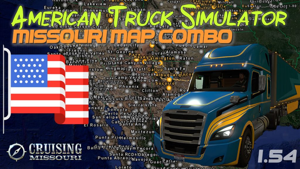 The big map combo for ATS 1.54 with Missouri DLC includes Coast to Coast, Promods Canada, Reforma, Beyond, Aleutian Islands, Sierra Nevada, EMMN and other mods. Links below consist 13 maps and additions. Only Free mods.